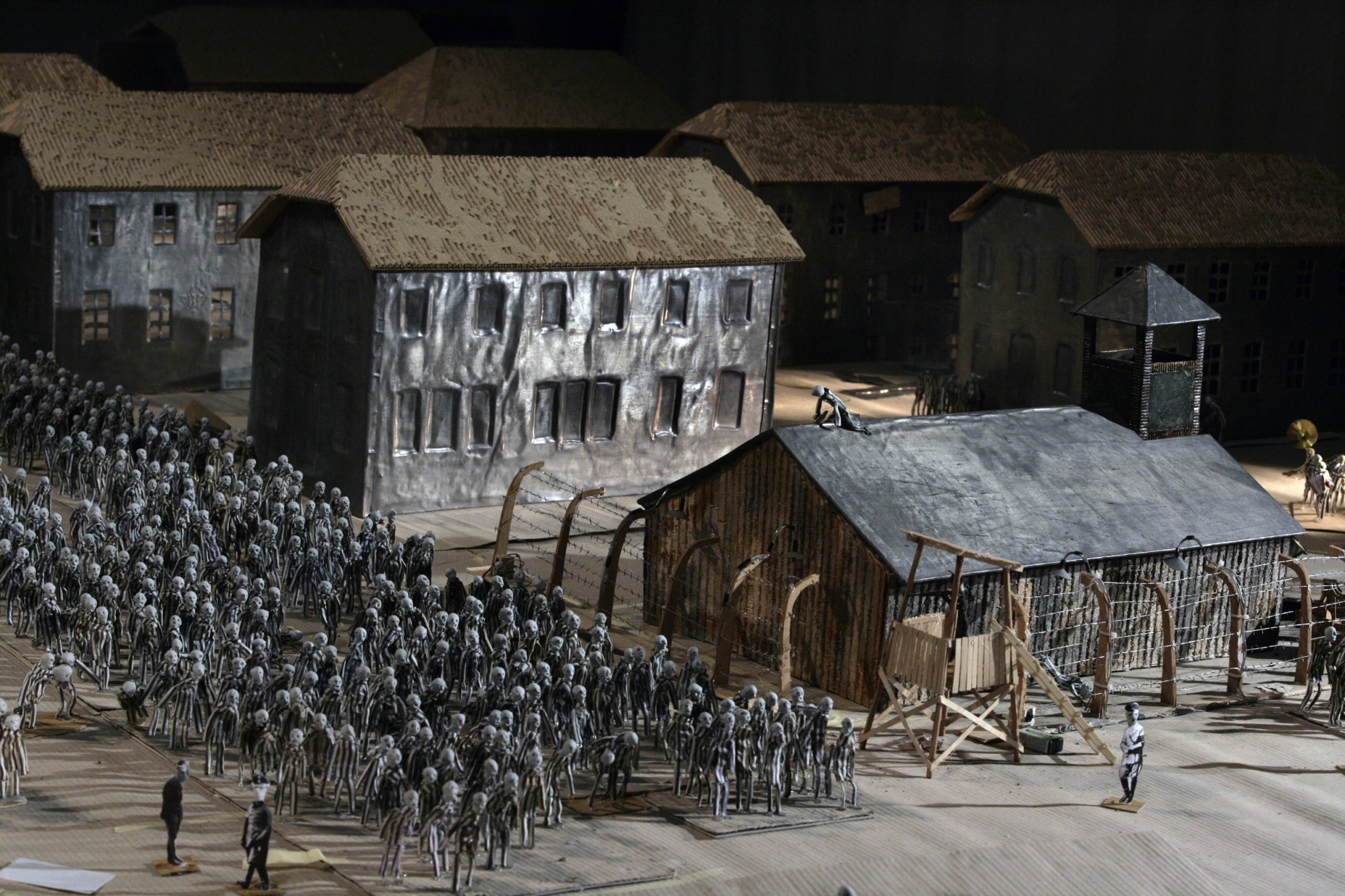 Een enorme maquette van Auschwitz-Birkenau vult het podium. Overvolle barakken, een spoorlijn, de poort met de woorden Arbeit macht frei. Op het toneel wordt de miniatuurversie van het kamp tot leven gewekt: duizenden geknutselde poppetjes van acht centimeter verbeelden de gevangenen en hun beulen. Als reusachtige oorlogsverslaggevers dwalen de spelers met minicamera’s door de maquette, filmen de gruwelijke gebeurtenissen en maken het publiek ooggetuige.
